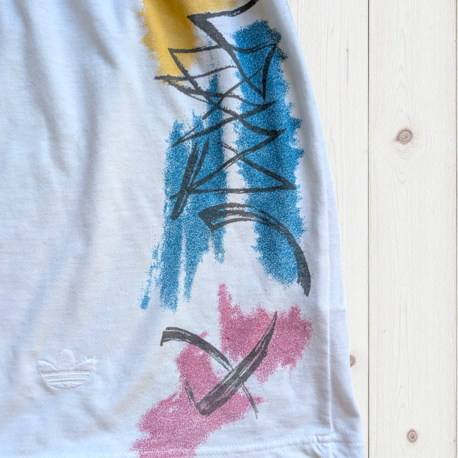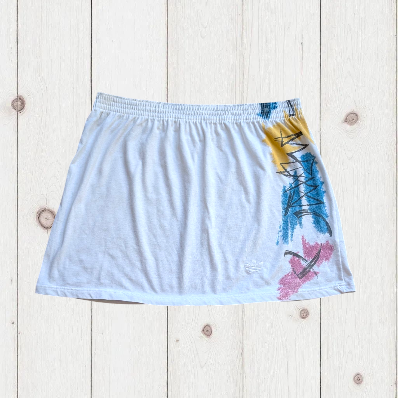 Description: Old label Adidas sporty white mini skirt. White base colour with a multi-colour graphic on the side in yellow, blue and magenta pink with black abstract marks. Cotton polyester blend. Sporty, flared A-line cute. Elasticated waist for a comfortable, pull-on fit. Embroidered logo in white. Great for ravewear