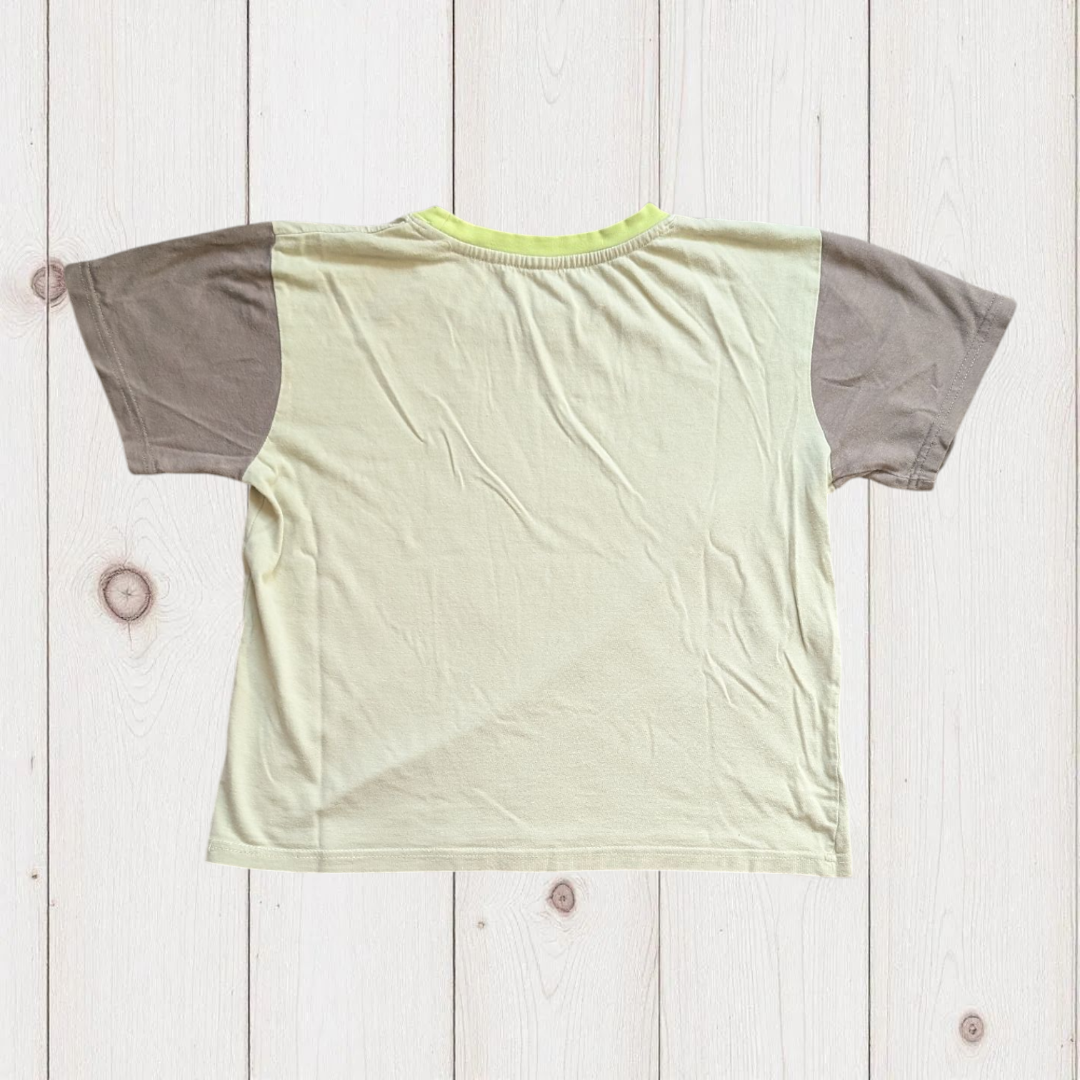 Description: Little Cheeky Monkey baby tee. Khaki stone base colour. Vintage-style ringer with contrasting trim on the neckline and cuffs in brown and lime green, adding a sporty, retro look. Baby tee silhouette with a fitted, slightly cropped fit. Graphic of a monkey on the chest. No label, but feels like a cotton blend jersey material