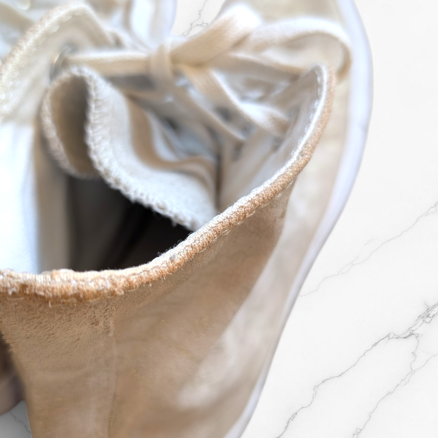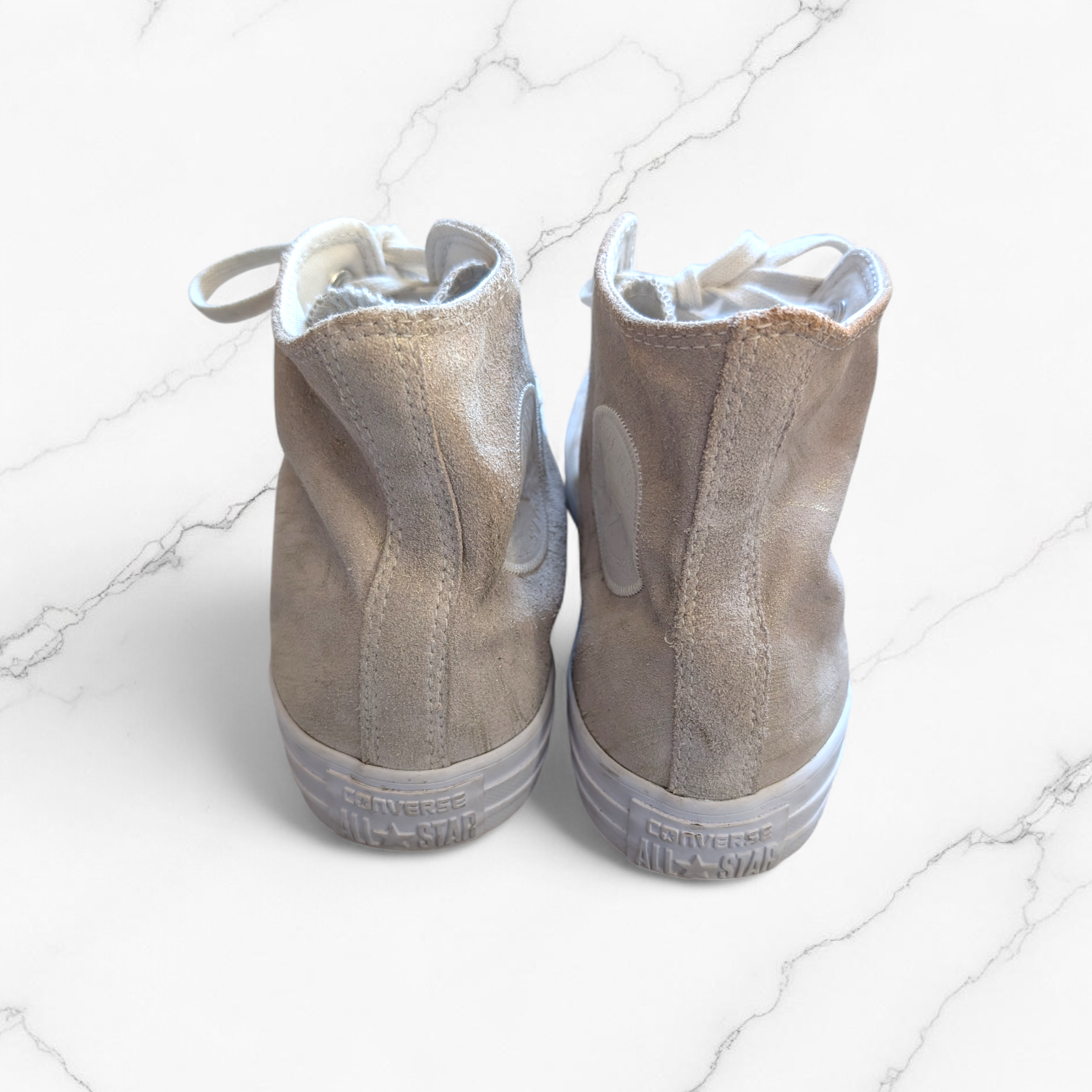 Description: A stunning and unique pair of Converse high tops in a sophisticated "Egret" beige canvas, decorated with artistic metallic gold brush-stroke accents. This pair is elevated by premium light gold-toned metal eyelets and a tonal light cream ankle patch for a cohesive, luxury look. They feature the iconic high-top silhouette, white rubber toe caps, and the signature "All Star" branding on the heel. A perfect statement sneaker for festival season or for adding a touch of shimmer to neutral outfits.