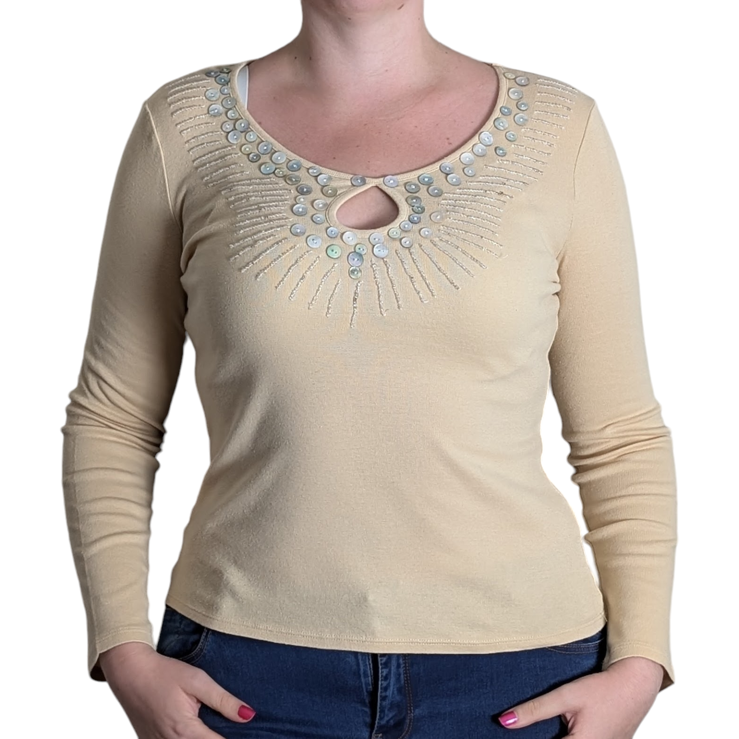Description: Old label M&S long sleeve cream/ light beige top with shell and sequin detailing around the neck. Fitted silhouette, flattering. Round neckline with distinctive cutout at the centre. Embellishment of iridescent shells and beads following the neckline. 100% cotton, soft and stretchy. Bohemian feel with a subtle sparkle