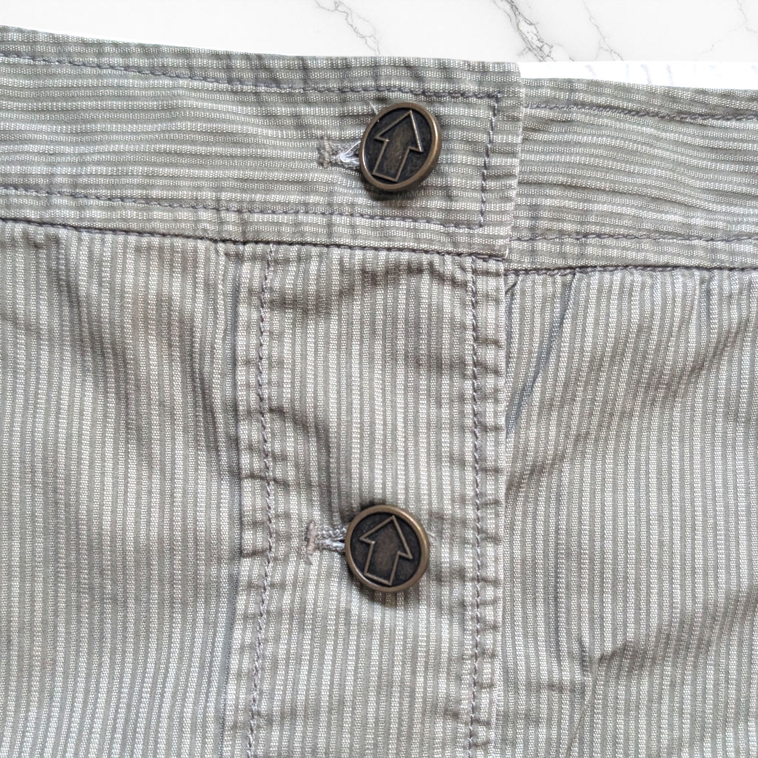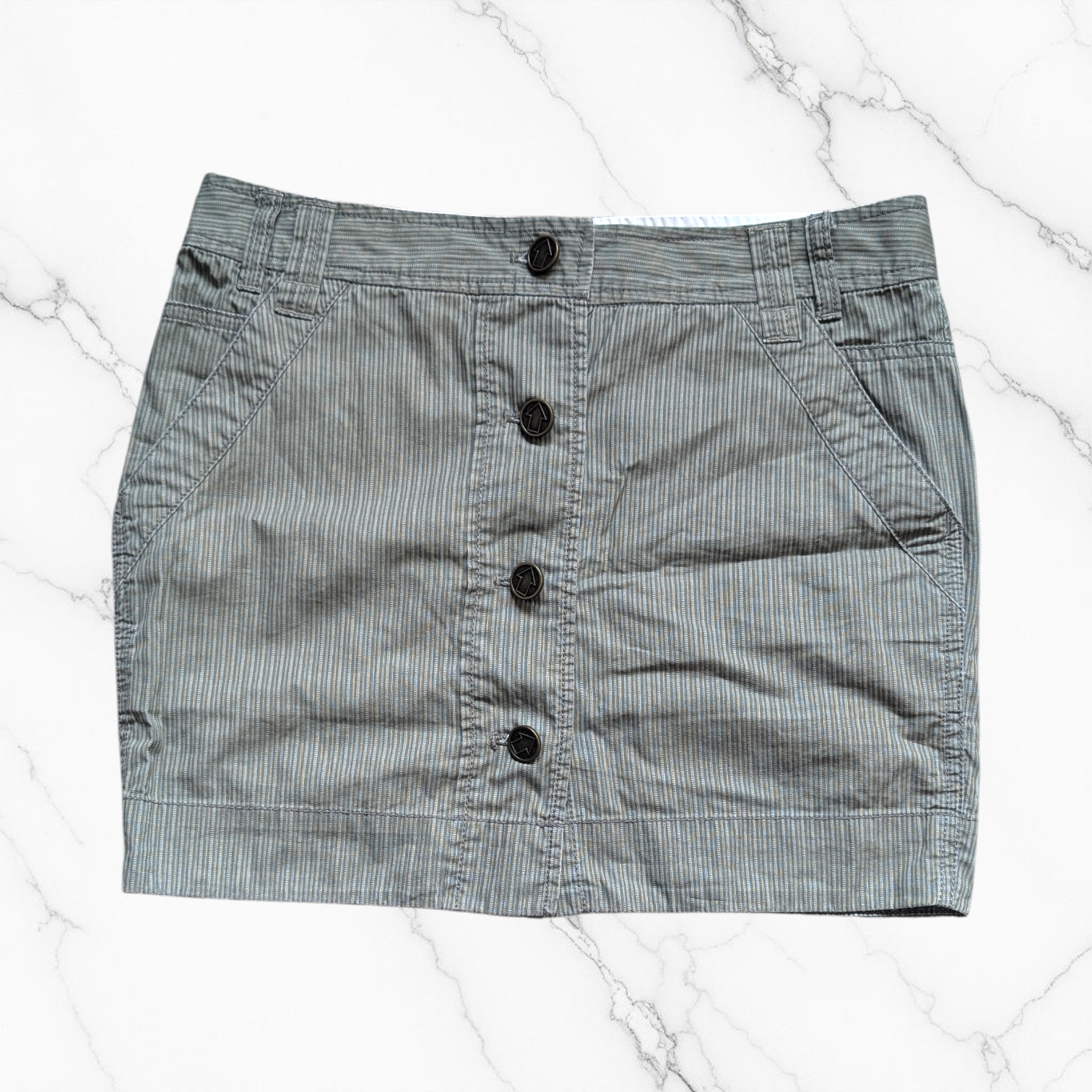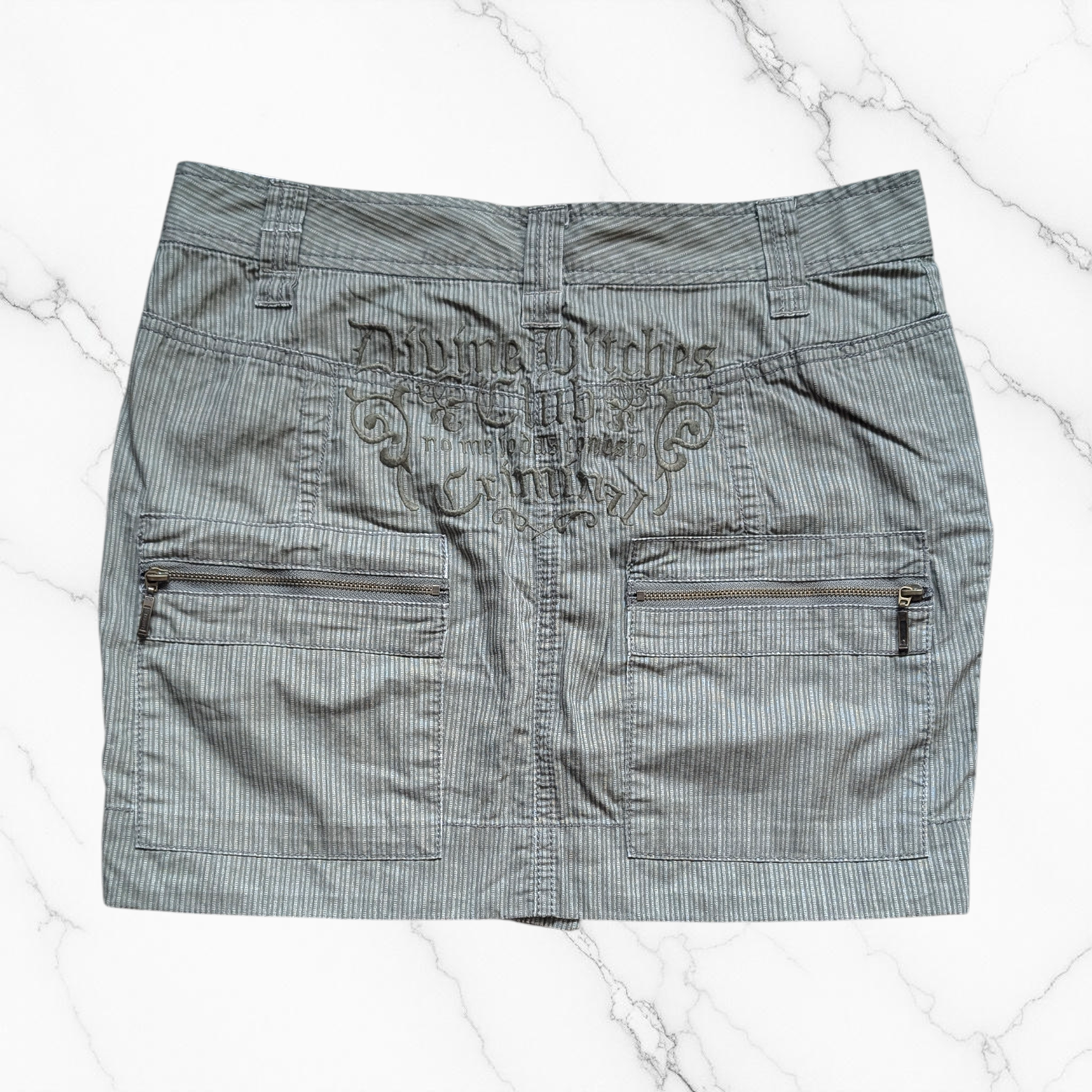 Description: Criminal Clothing khaki grey pinstripe mini skirt. A rare, early 2000s gem from the cult UK label Criminal Clothing. This skirt perfectly captures the "Indie Sleaze" era with its heavy-duty utility construction and bold, tongue-in-cheek rear embroidery. Classic pinstripe set against a rugged Khaki / Olive grey 100% cotton twill. Dark brass-tone buttons featuring distinctive engraved arrows; matching brass-tone zips on the rear pockets. Full button-down front, functional belt loops, and an embroidered "Divine Bitches Club" slogan across the back. Low-rise fit.