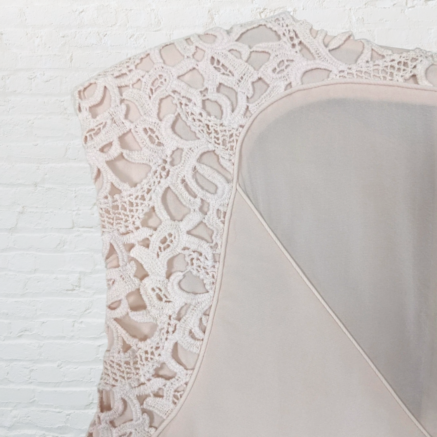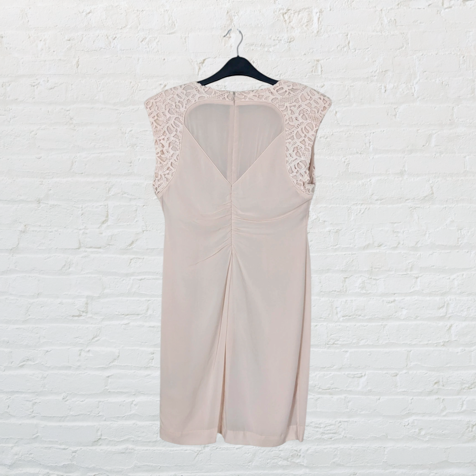 Description: Mint Velvet silk-blend dress. A stunning, ultra-soft bodycon dress that balances elegance with a romantic, delicate feel. The outer shell is crafted from a luxurious silk blend (91% silk, 9% elastane), offering a beautiful sheen and gentle stretch for the perfect fit. Fully lined for comfort and features a decorative 100% cotton lace trim. Sophisticated ruched neckline and intricate panels, creating a flattering silhouette. Falls to knee-length and finished with feminine cap sleeves. Sheer deep V-back with a concealed zip fastening. A beautiful, high-end piece with a level of detailing that is popular for wedding guests and formal events