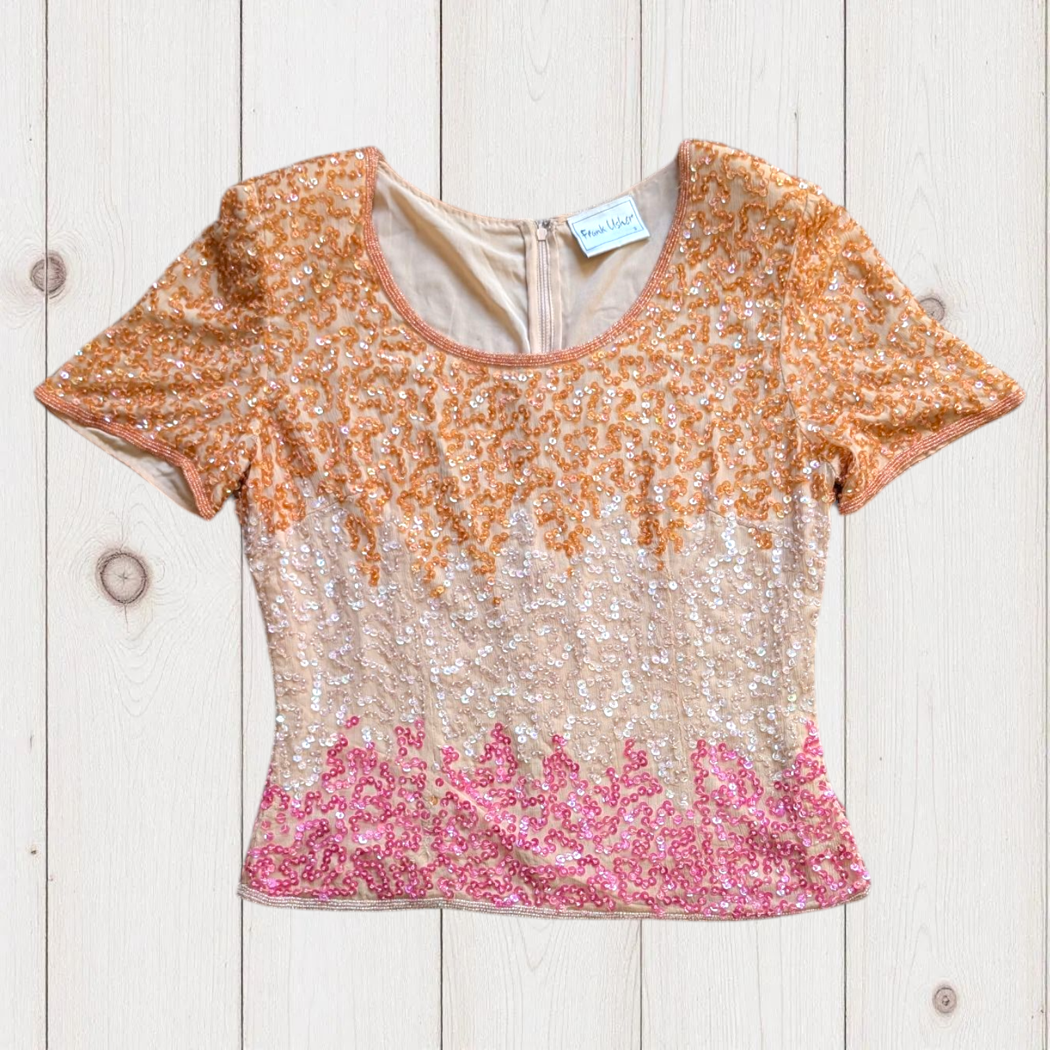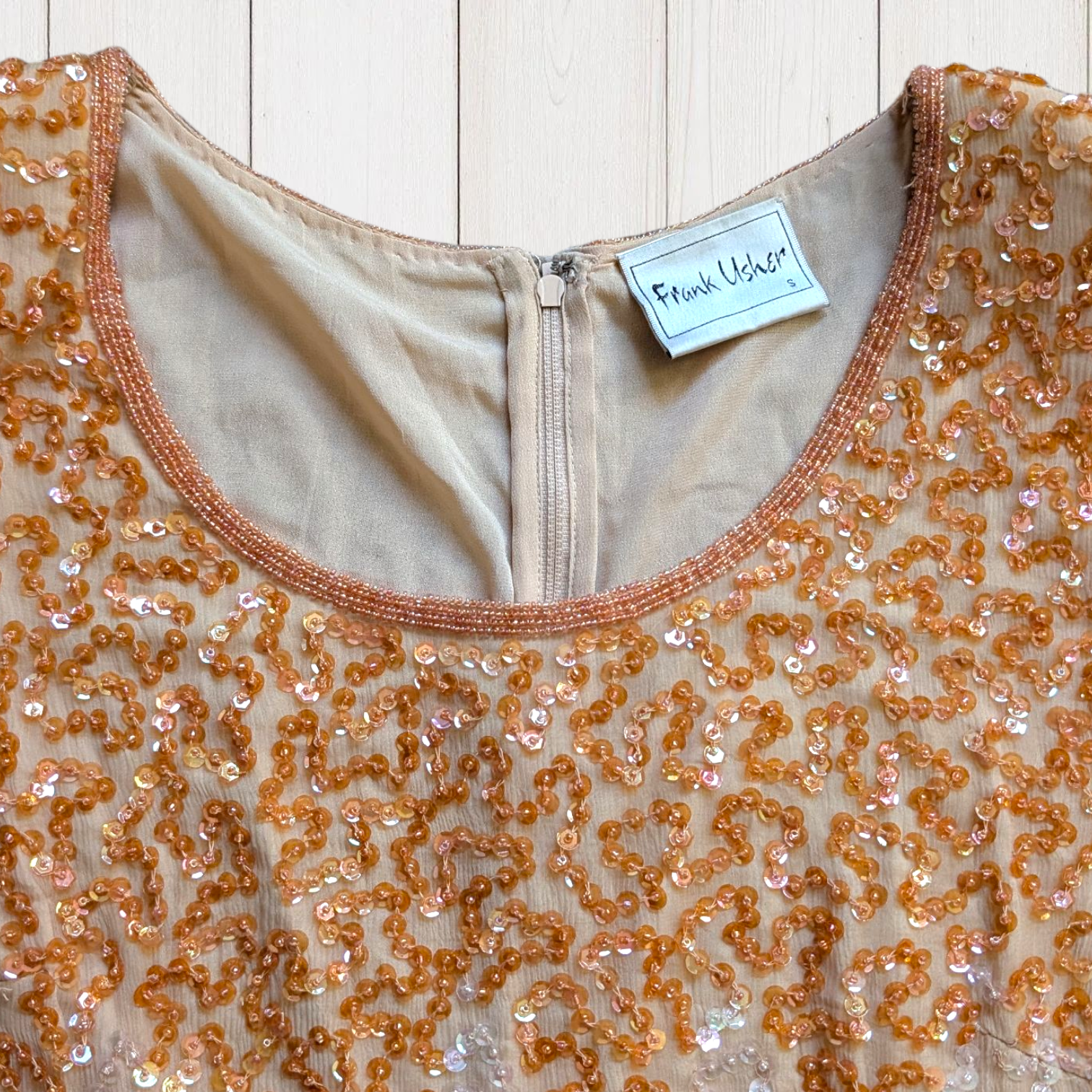 Description: 1980s vintage label Frank Usher intricate beaded beige, orange and pink short sleeve top. Beige colour base with vibrant orange and pink beads. Beaded throughout, great quality and gives it a bit of weight. Slightly padded at shoulders to give shape. Zip all the way down the back for ease of wear. Silk outer shell, lining is polyester, Beautiful statement piece with disco, party vibes