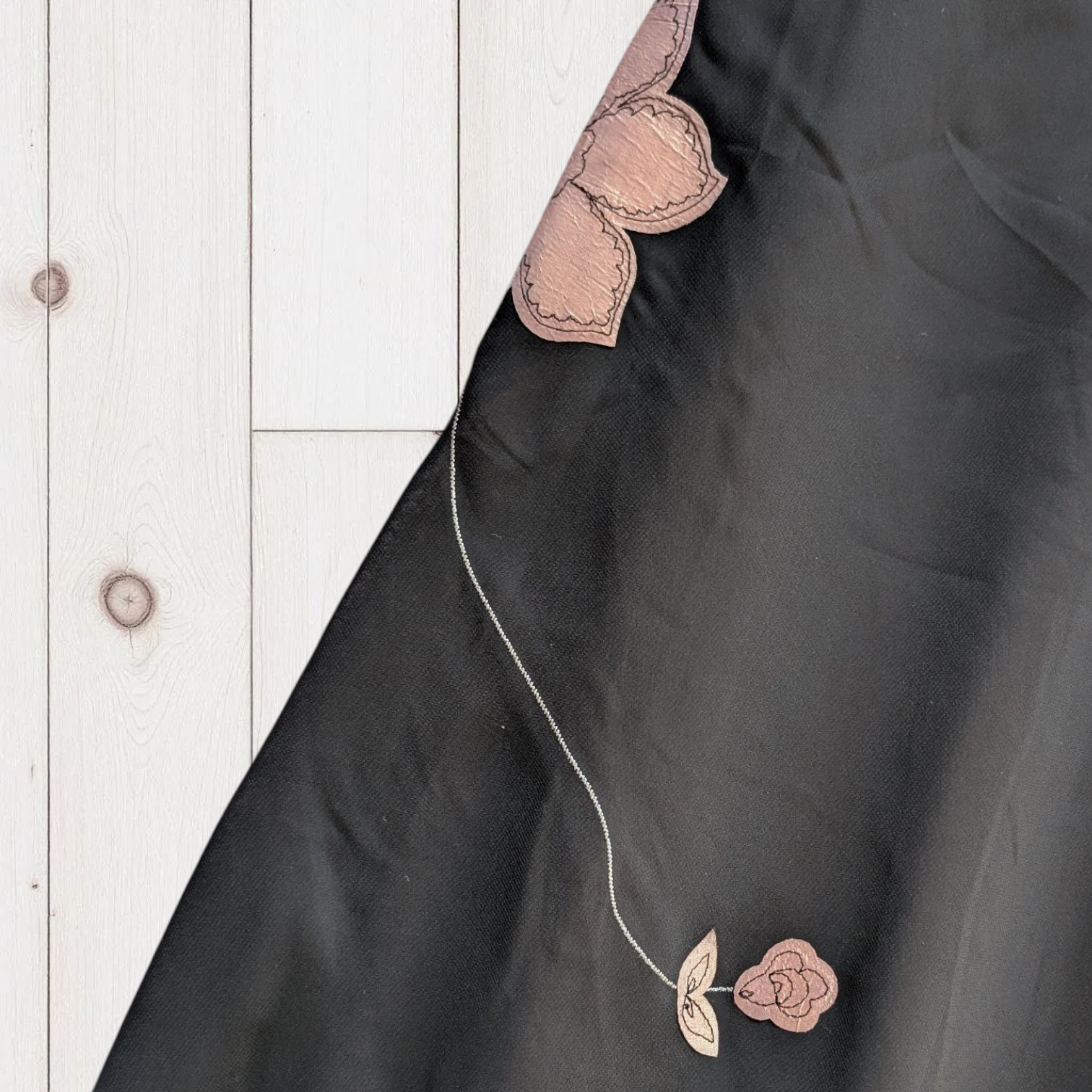 Description: Vintage Kookai black strapless dress from the 90s. A-line silhouette with a fitted, structured bodice. Flattering sweetheart neckline. Detailed with delicate embroidery and applique flowers in dusty pinks and mauves, giving it a feminine and textured look. Polyester shell and is fully lined for comfort and structure. Zip closure at the side. Falls between knee-length and a mini dress depending on height