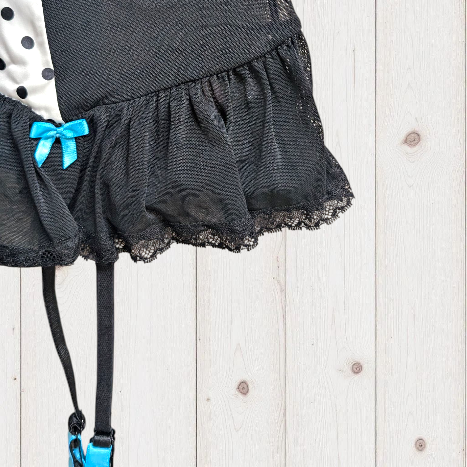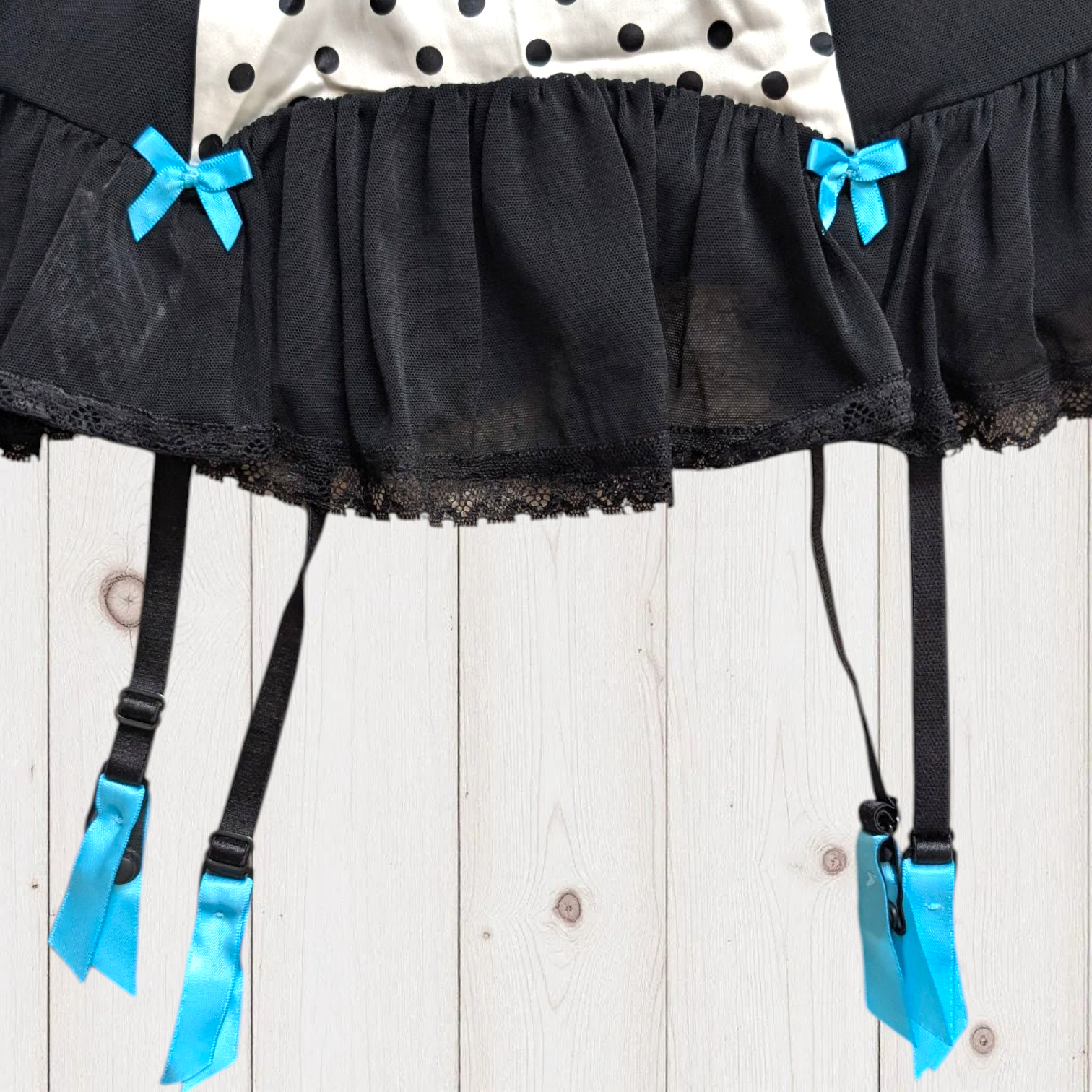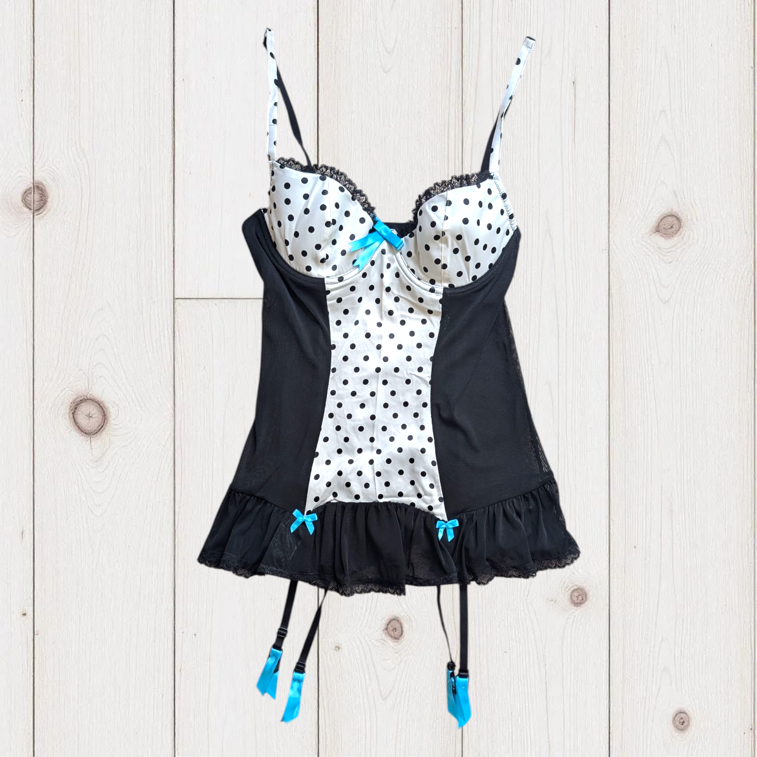 Description: La Senza polka dot bustier top. The main body is a black, semi-sheer mesh fabric. The centre panel is a white satin-like material with a black polka dot pattern. Padded bust with an underwire bra style trimmed with black lace ruffle. Turquoise blue pops of colours on ribbon bows. Adjustable straps. Four garter straps at the bottom hem. Hook-and-clasp bra closure with a cutout below on the back
