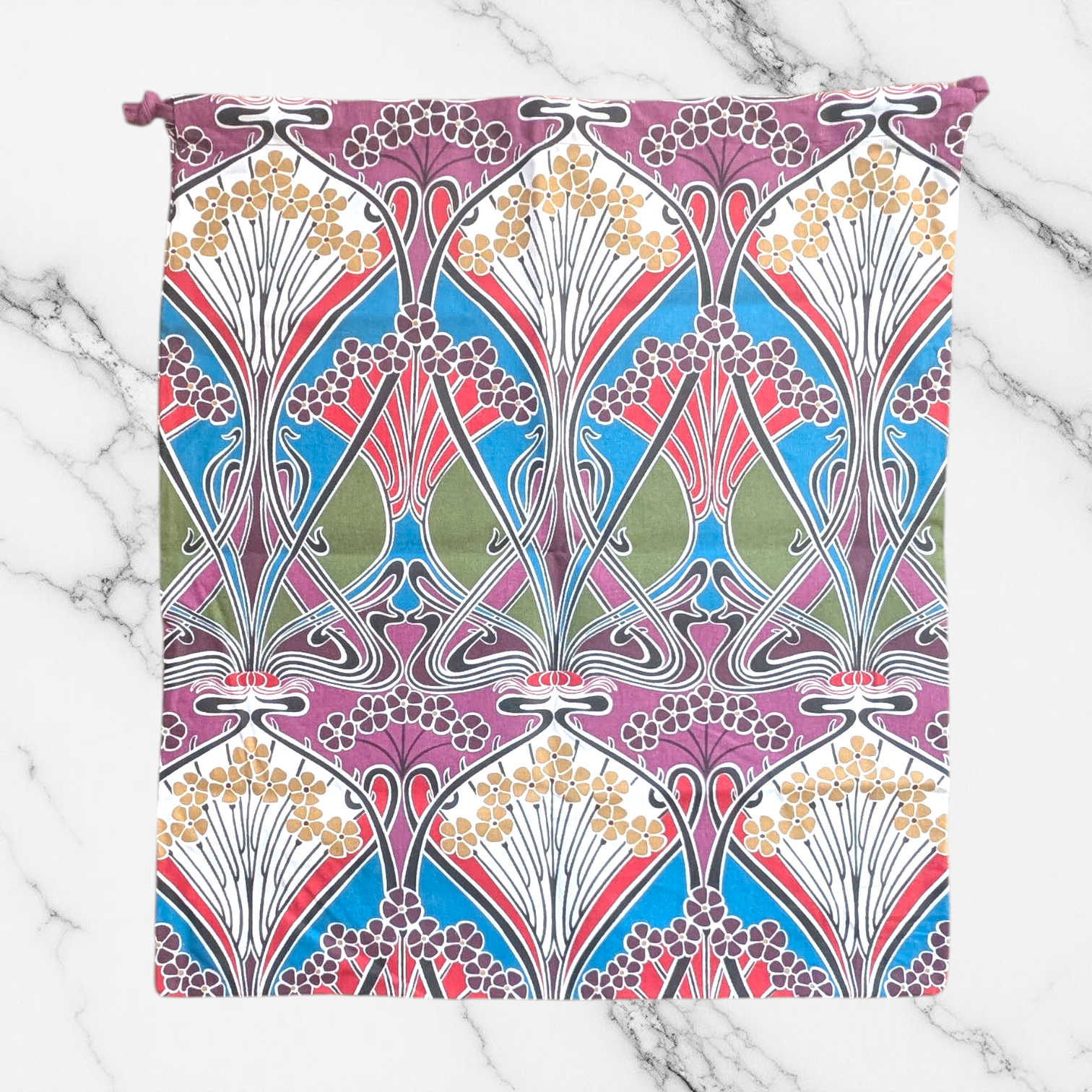 Description: Liberty of London limited edition drawstring bag. Originally released as part of the 150th anniversary celebrations featuring the lanthe print - a classic Art Nouveau floral featuring intricate lilies and violets in a vibrant palette of fuchsia pink, royal blue and golden mustard. 100% high quality cotton. Secure double-knotted drawstring closure, reinforced stitching. Perfect for room decor, luxury gift packaging, laundry and bag storage.