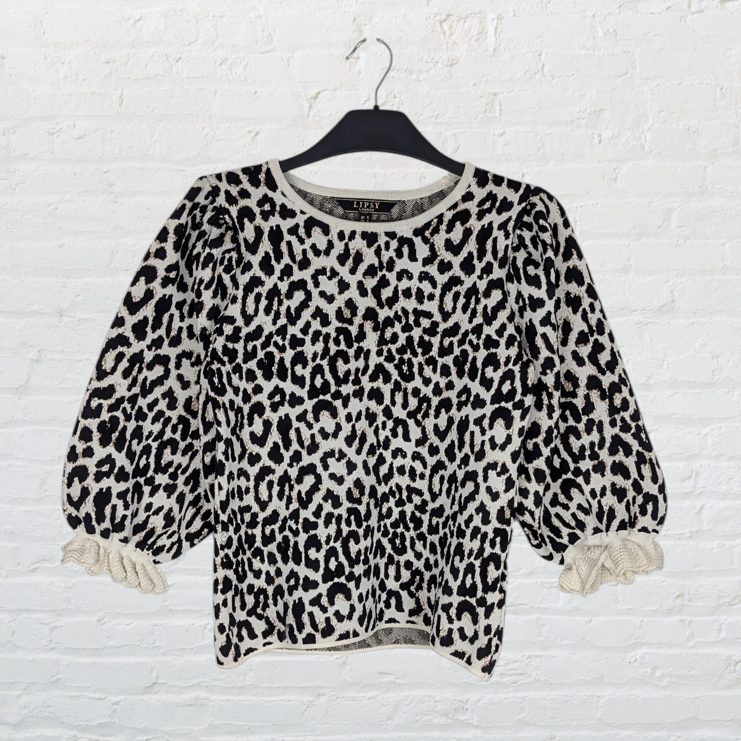 Description: Lipsy leopard print puff sleeve top. A striking piece with the bold animal print in black and beige brown on an off-white, cream background colour. Elegant 3/4 length puff sleeves that are finished with beautiful ruffled cuffs, giving a romantic touch. Crafted from lightweight polyester that offers a comfortable stretch for a contouring fit. Standard to short length top, sitting just above the hip for most.