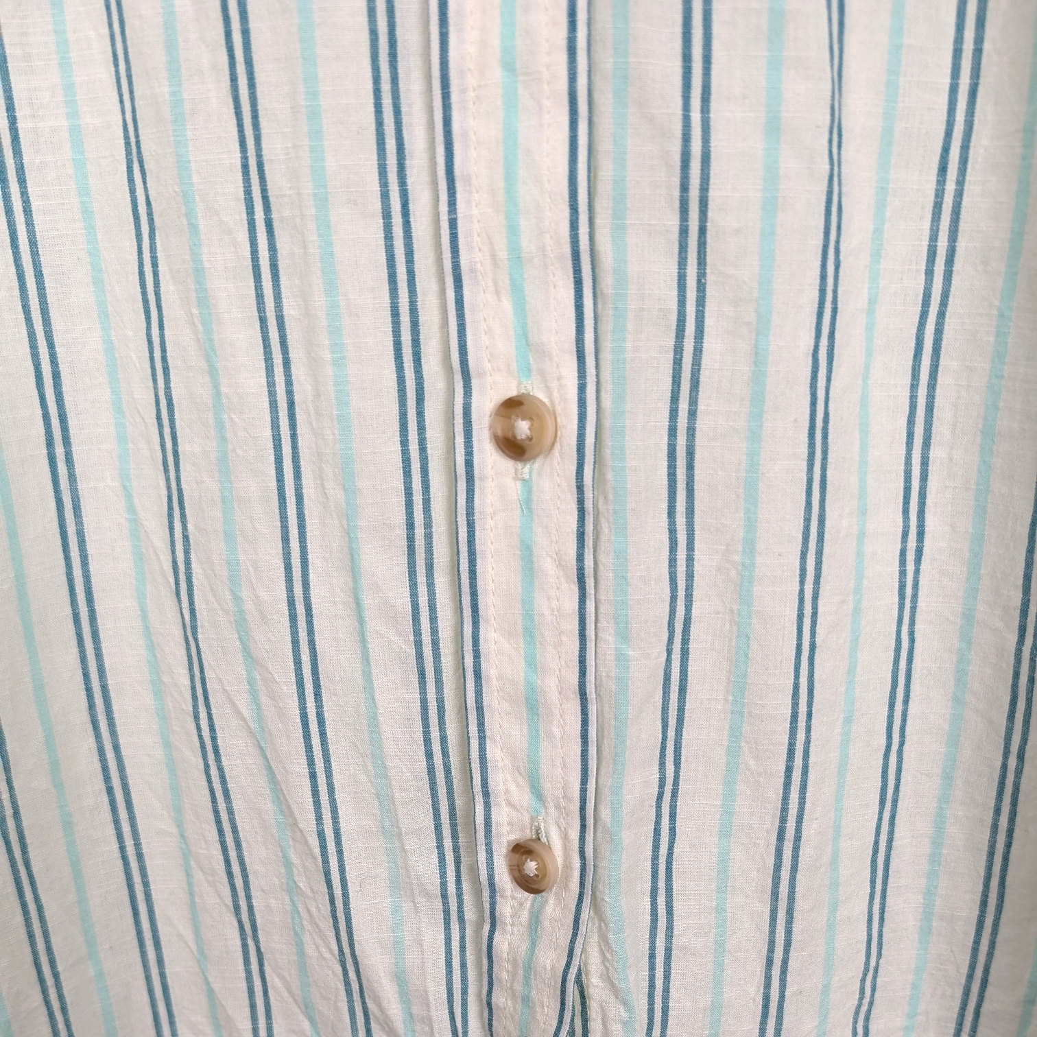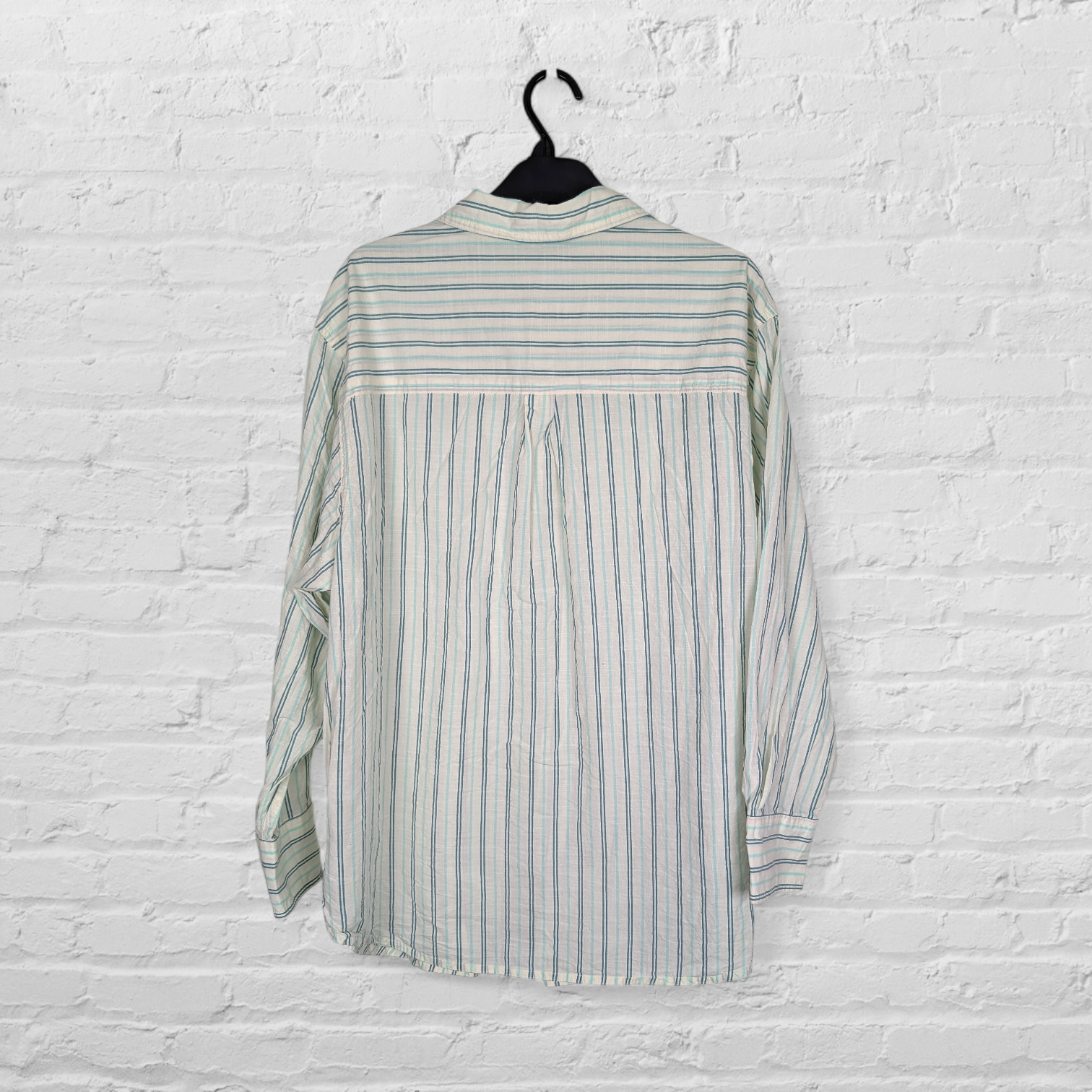 Description: Marks & Spencer Collection cream, green and mint striped shirt. Light cream, subtle and soft neutral base colour with vertical stripes in green and mint. 100% cotton, breathable and comfortable with a naturally soft feel. It is slightly sheer, which is common for lightweight cotton and is ideal for layering or as a bikini cover-up. Long sleeve, finished with buttoned cuffs. Full button down front and collared. Classic, slightly relaxed cut perfect for comfortable wear