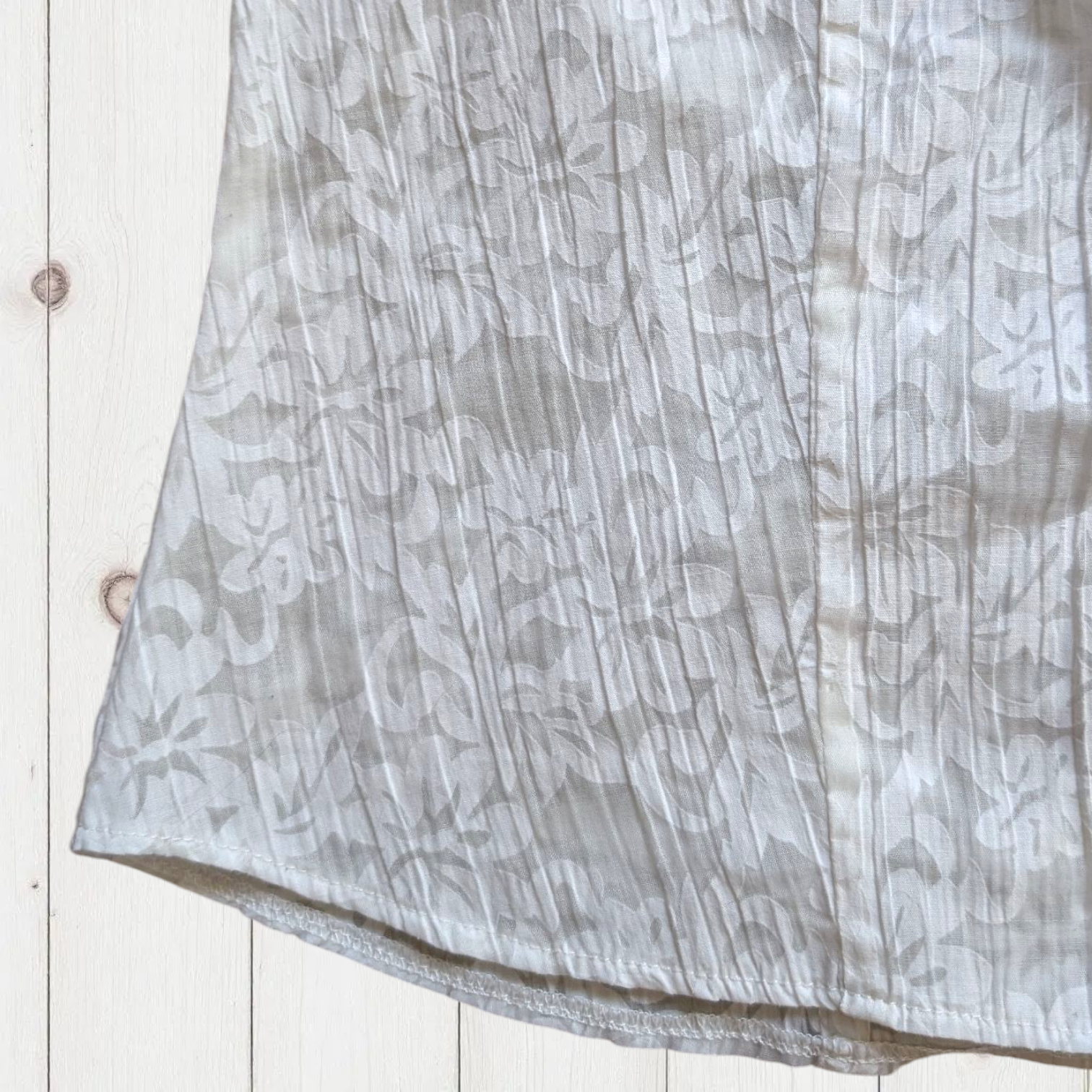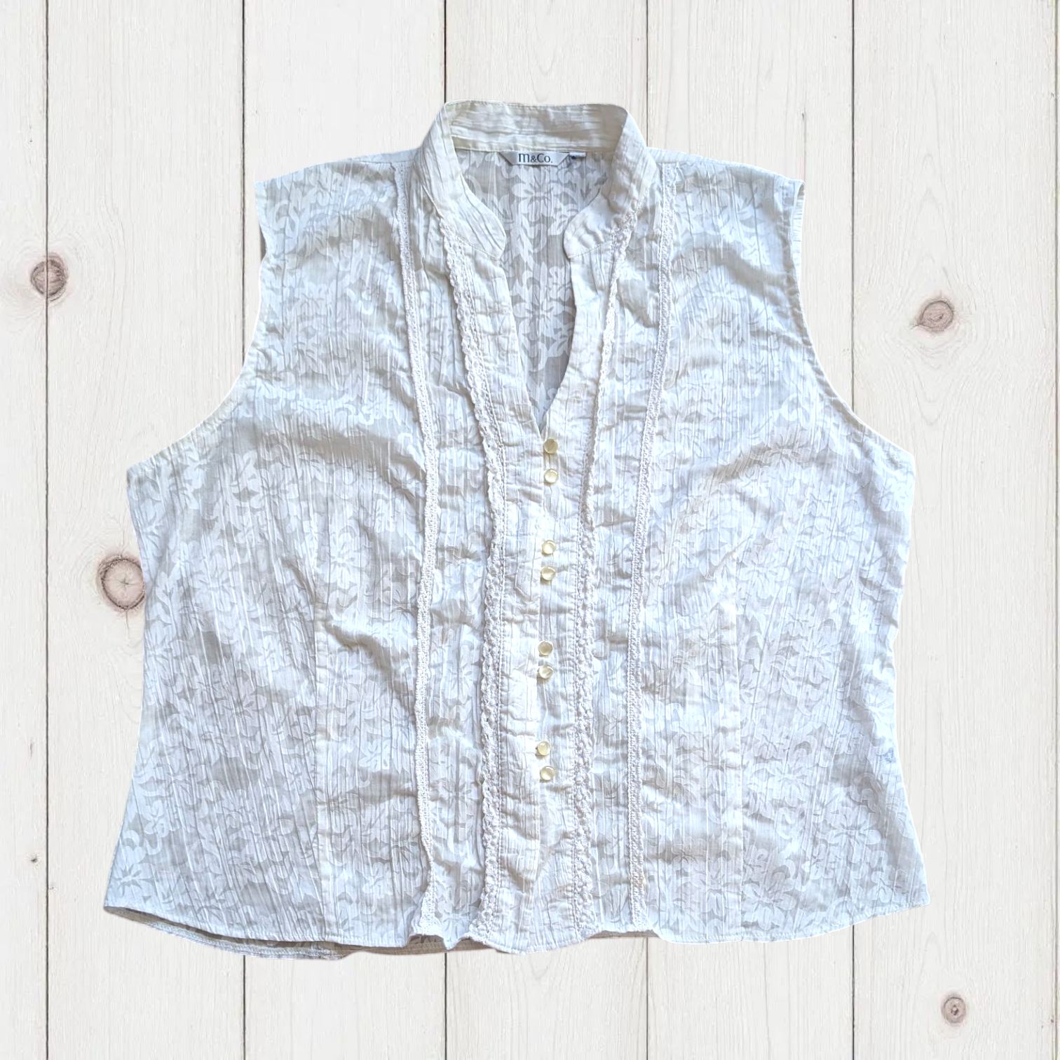 Description: Old label M&Co ivory white floral blouse. Polyester cotton blend, giving it a soft and comfortable feel whilst being lightweight and slightly sheer. Open, camp collar with a V-neckline. Pearlescent button down closure on the front. Sleeveless. Lace piping detailing. A feminine, cottagecore style piece