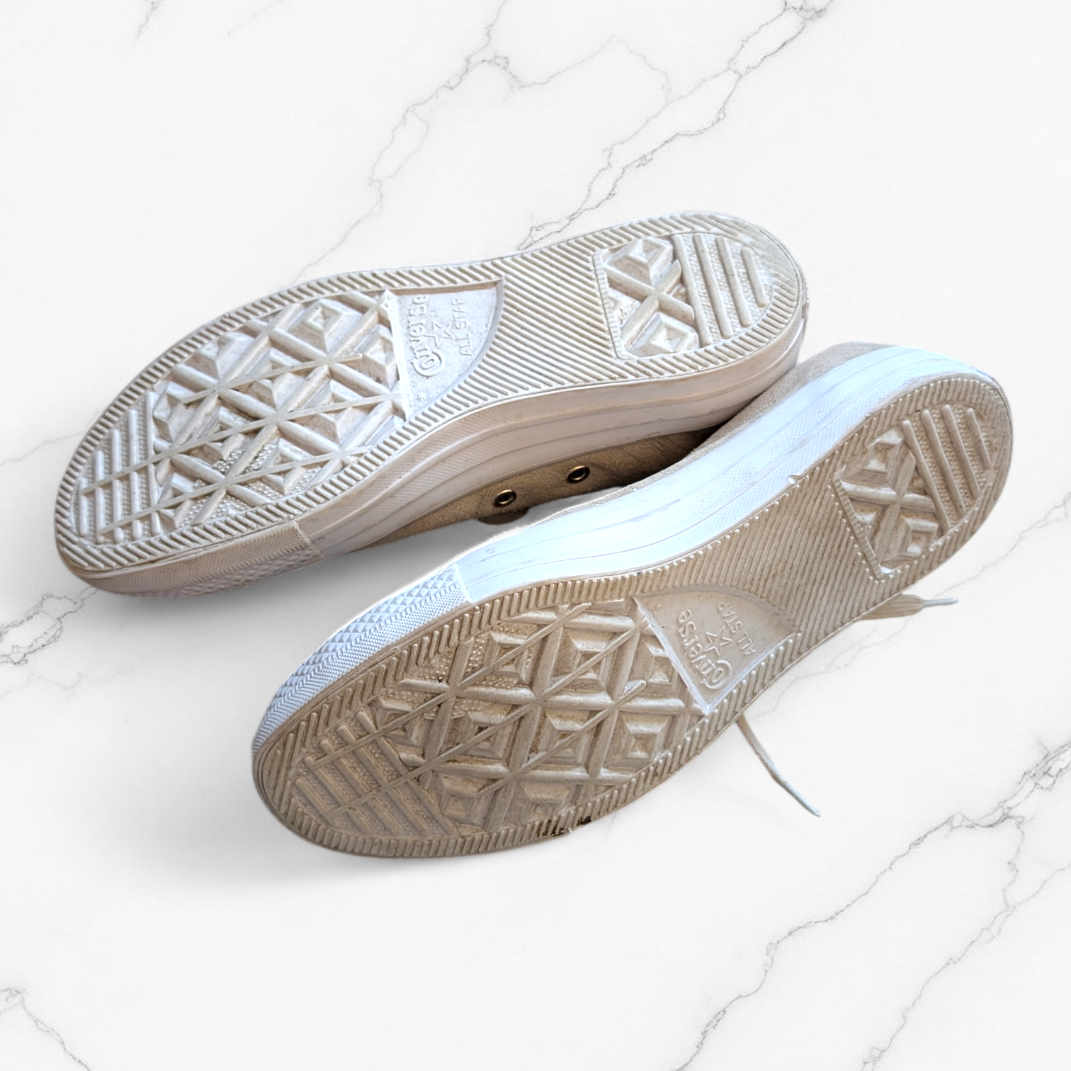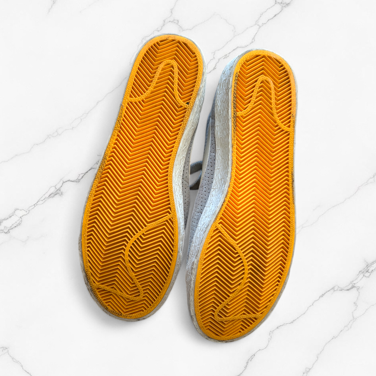 Condition: The soles are in good structural condition with plenty of grip left. There are some visible stains on the suede (as pictured) which may improve with a specialized suede cleaner. The laces are included but appear "washed out". These flaws are reflected in the competitive price.
