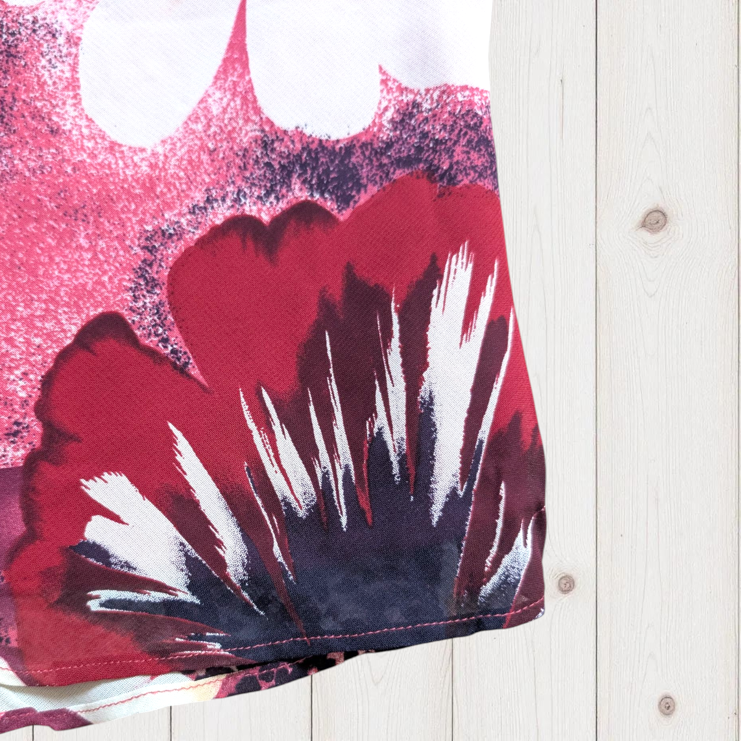 Description: Old label Marks & Spencer vibrant floral cami top. Multicoloured floral pattern in red, white, pink and dark purple. Intricate "hand-finished" sequin detailing sewn onto the fabric for sparkle and texture. Thin, spaghetti strappy shoulders. Fully lined, fantastic quality. Relaxed, flowy fit. Fairy vibes