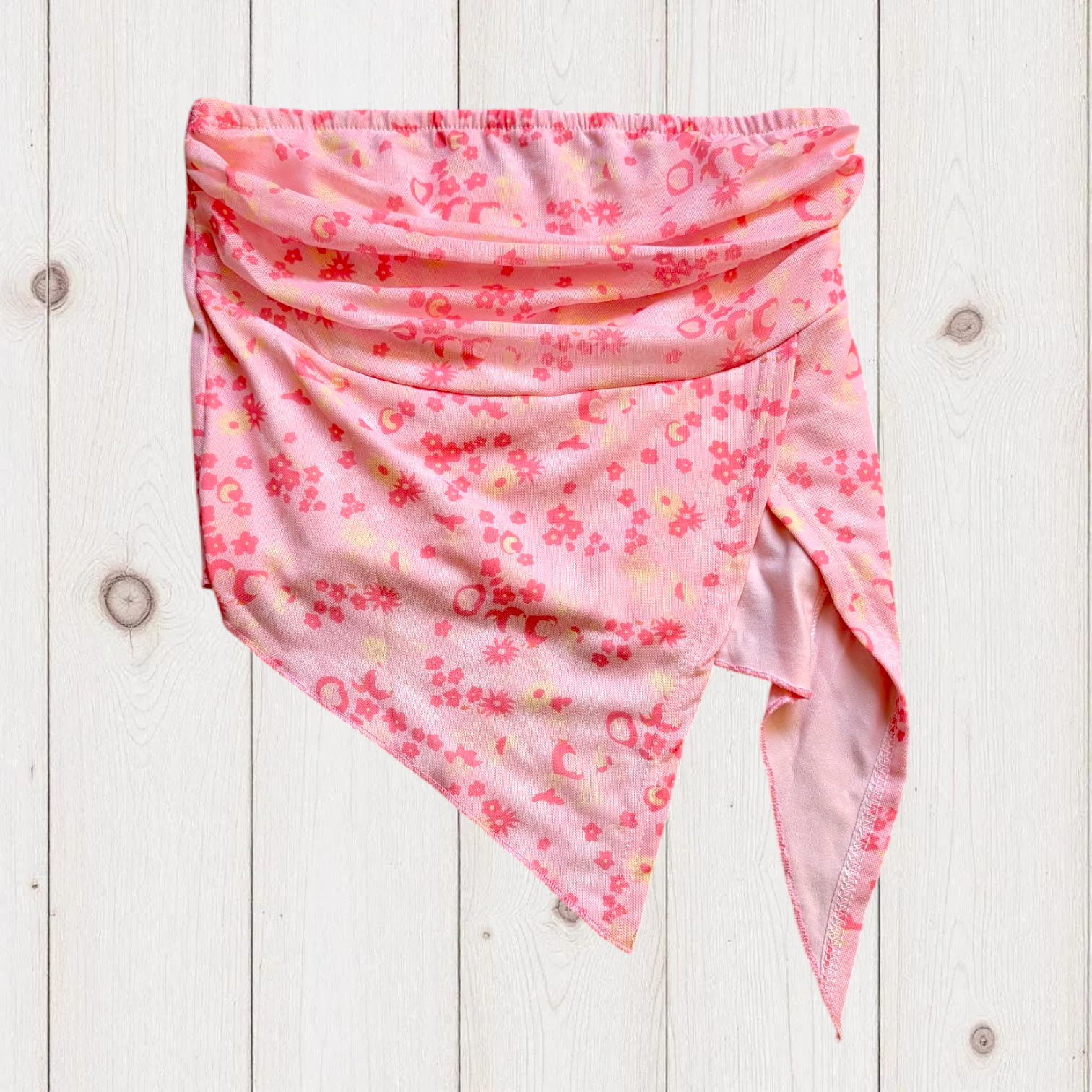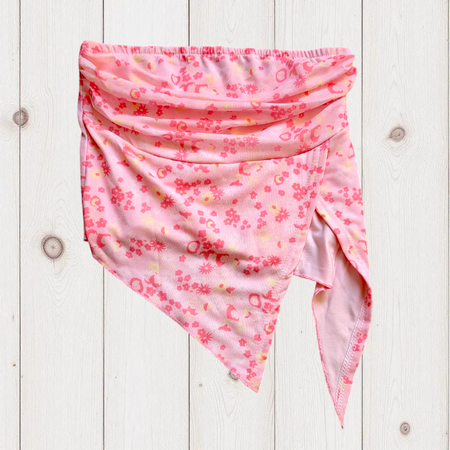 Description: Baby pink floral strapless crop top. Short, cropped tube top with a handkerchief style hem which is asymmetrical. Bubblegum pnk colour with an all over floral print in darker pinks and yellow. Elasticated top edge, to be worn bandeau style. Lightweight and stretchy material