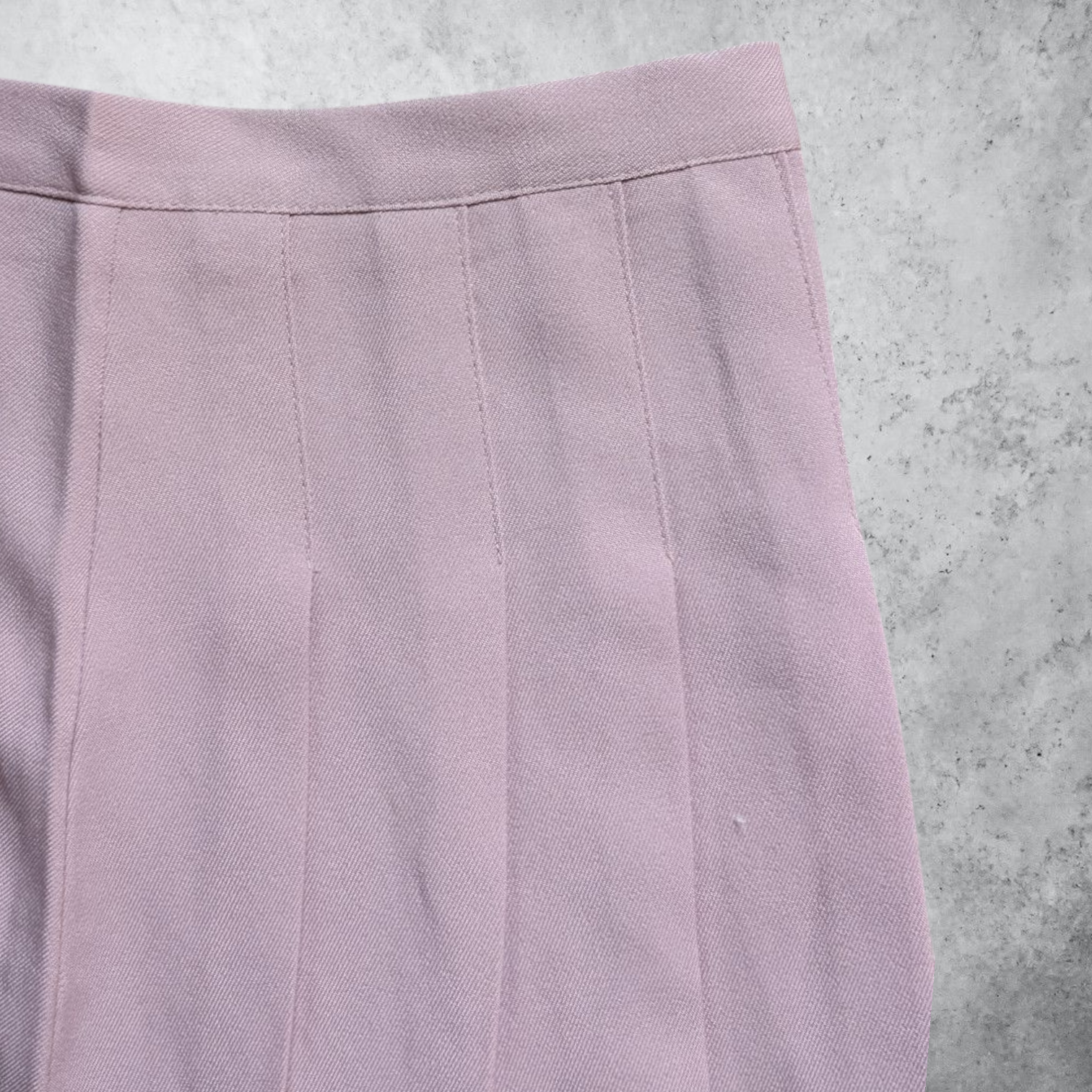Description: Mei Han Hui Yi Jiao dusky rose pink pleated tennis skirt. Chinese brand, so fits a lot smaller than XL - please check measurements. Sharp pleats running vertically, giving a structured and flared silhouette. Zip closure at the side. Mini length