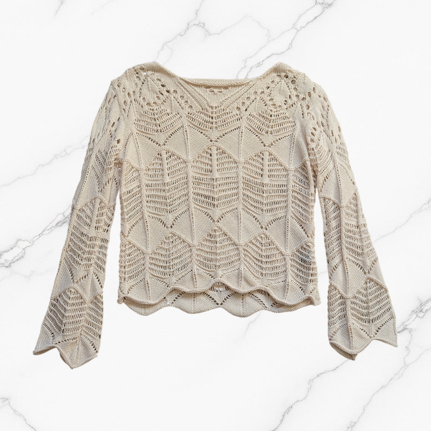 Beige Sand Crochet Open Knit Long Sleeve Top