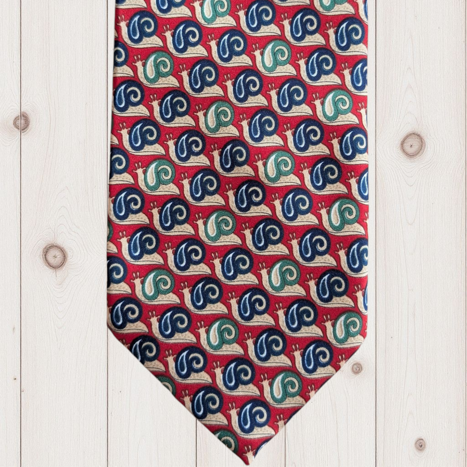 Description: Vintage St Michael snail pattern tie. Main colour is a burgundy red, with a standout all over pattern of snails in green and navy blue. Whimsical, retro vibes. Made in the UK, fantastic quality