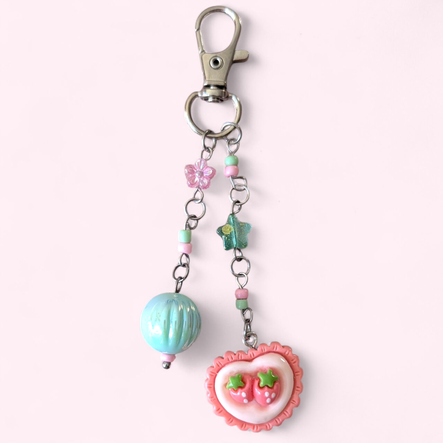 Handmade with jump rings and beads. Featuring a cute charm. Hangs on a lobster clasp