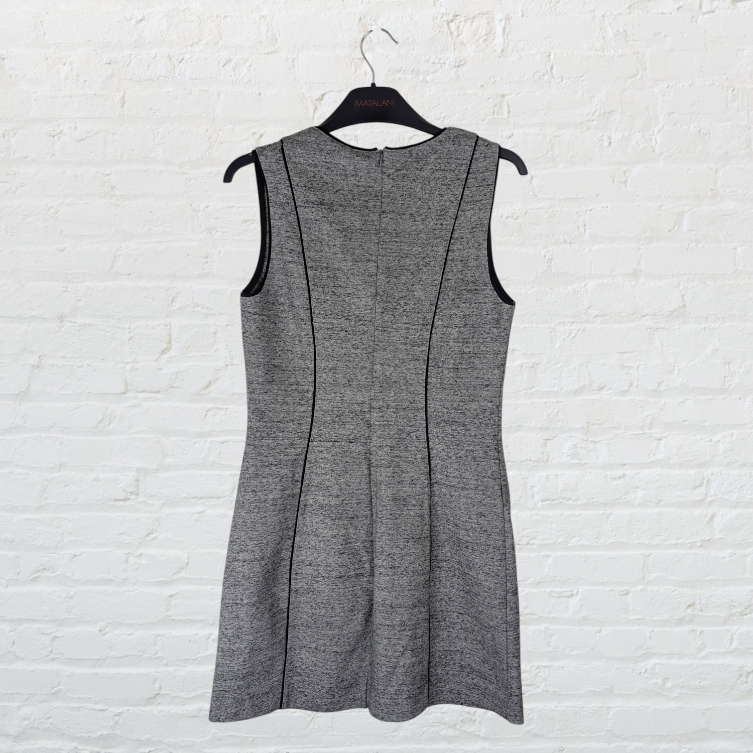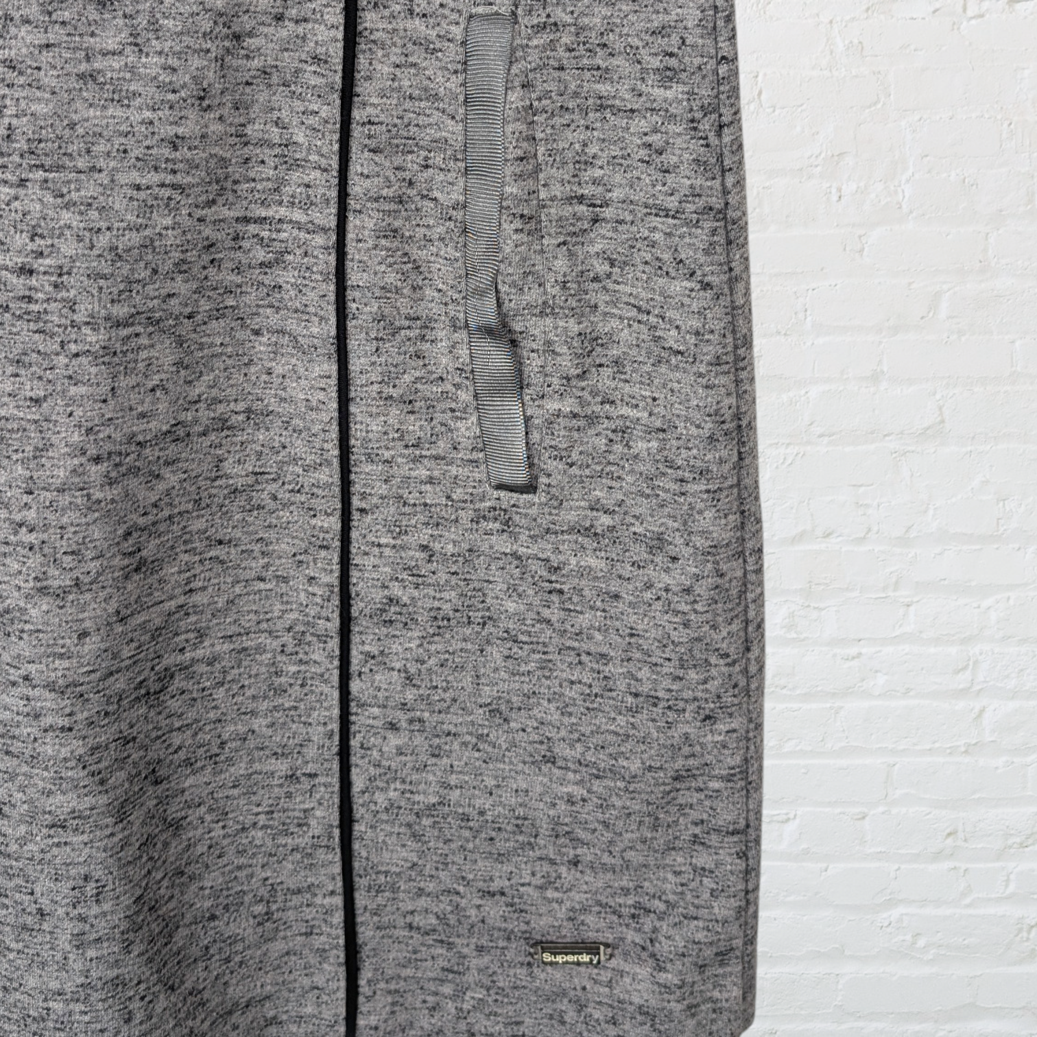 Description: Superdry Tailored Jersey Dress with Zip Back & Black Piping. A sophisticated, structured day dress that bridges the gap between comfort and professional style. This piece features a thick, high-quality jersey in a versatile grey marl, accented with sharp black piping that defines the silhouette. The zip at the back adds a premium, tailored finish. 54% Polyester, 45% Cotton, 1% Elastane (Thick jersey with a smart drape). Mini length.