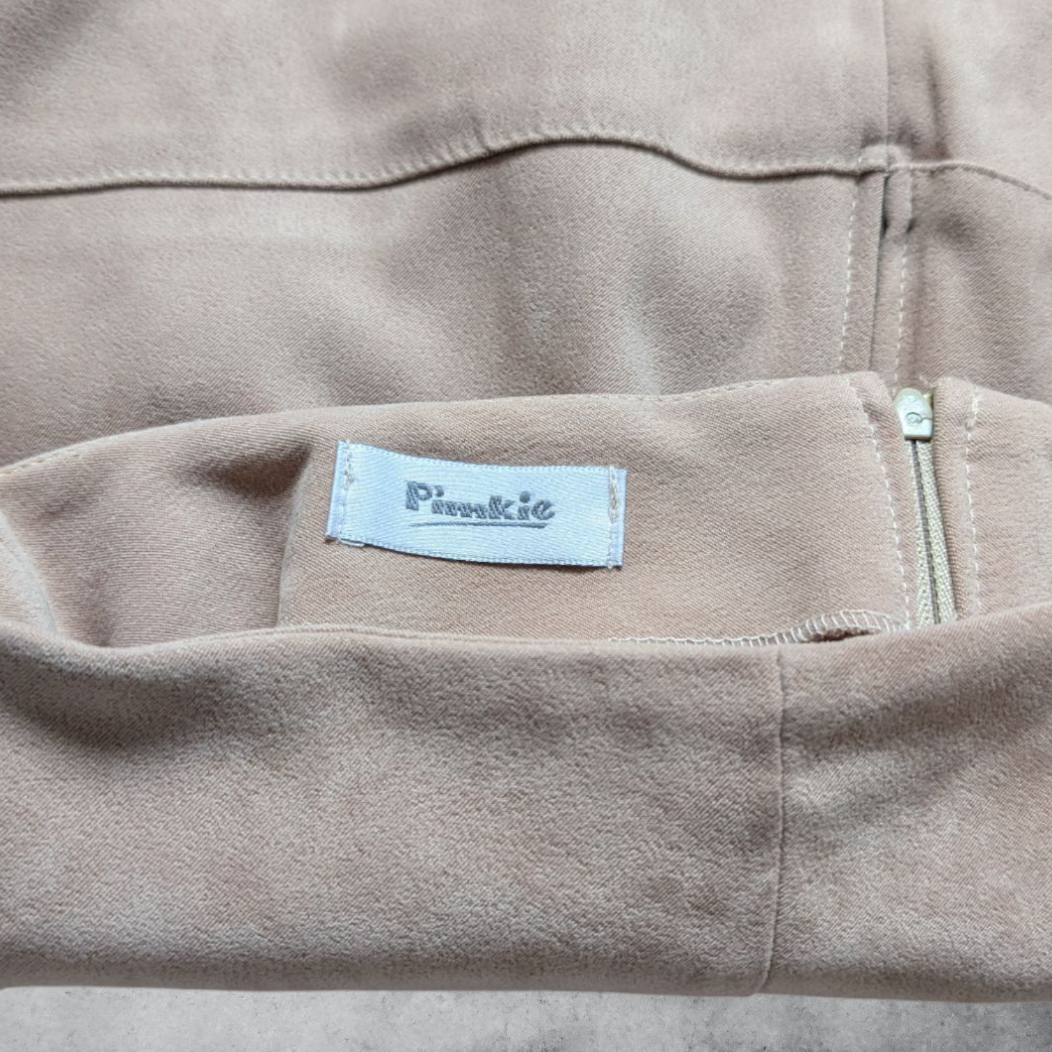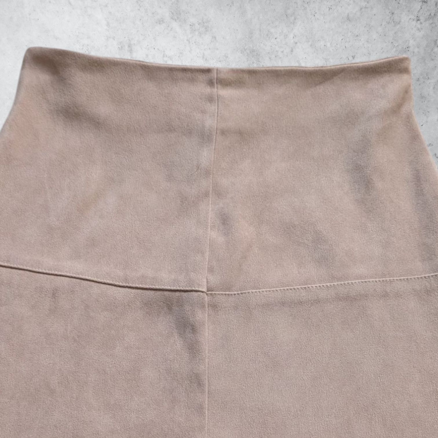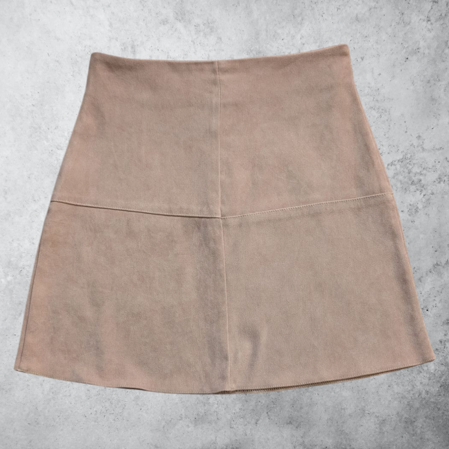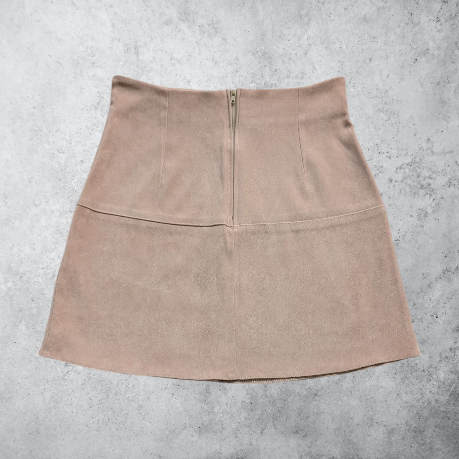 Description: Old label Pimkie tan/beige faux suede A-line skirt. Mini length. Really soft, brushed texture. Panelling in fours. Zip closure at the back. Chic, retro vibe of 60s/70s inspiration
