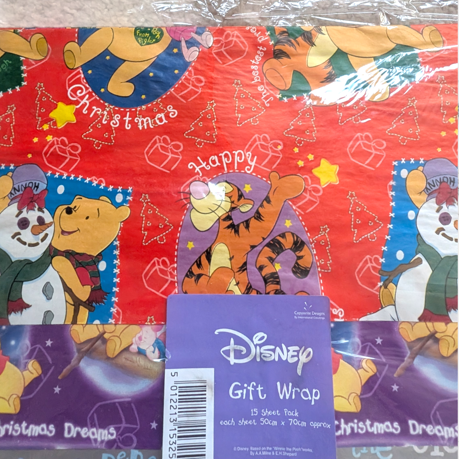 Description: Authentic vintage 1990s Disney Winnie the Pooh Christmas gift wrap. Featuring a vibrant, high-saturation design, perfect for those seeking a nostalgic "kidcore" or maximalist holiday aesthetic. Featuring Pooh, Tigger, Piglet and Eeyore in winter settings. 15 sheets. Circa 1996/1997.